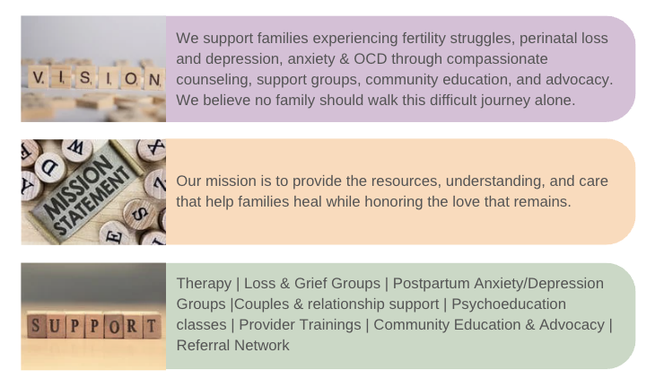 We support families experiencing fertility struggles, perinatal loss and depression, anxiety & OCD through compassionate counseling, support groups, community education, and advocacy. We believe no family should walk this difficult journey alone.